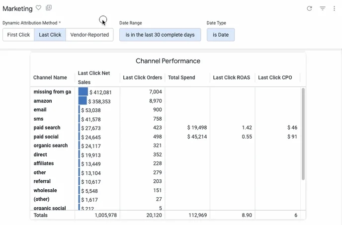 For a high-level view across your business, the Marketing Attribution explore aggregates order-level data by channel and vendor.