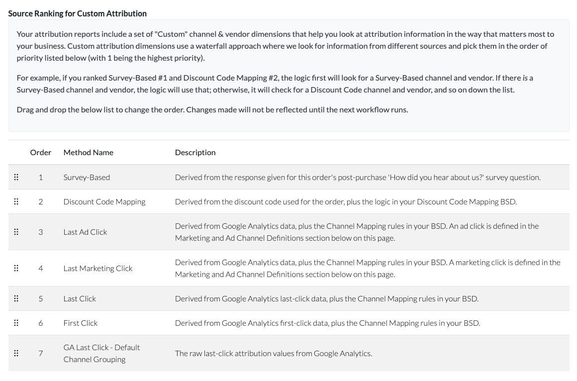 Custom Attribution lets you rank which attribution sources are most important to you, like in the example below from the Attribution Settings BSD: