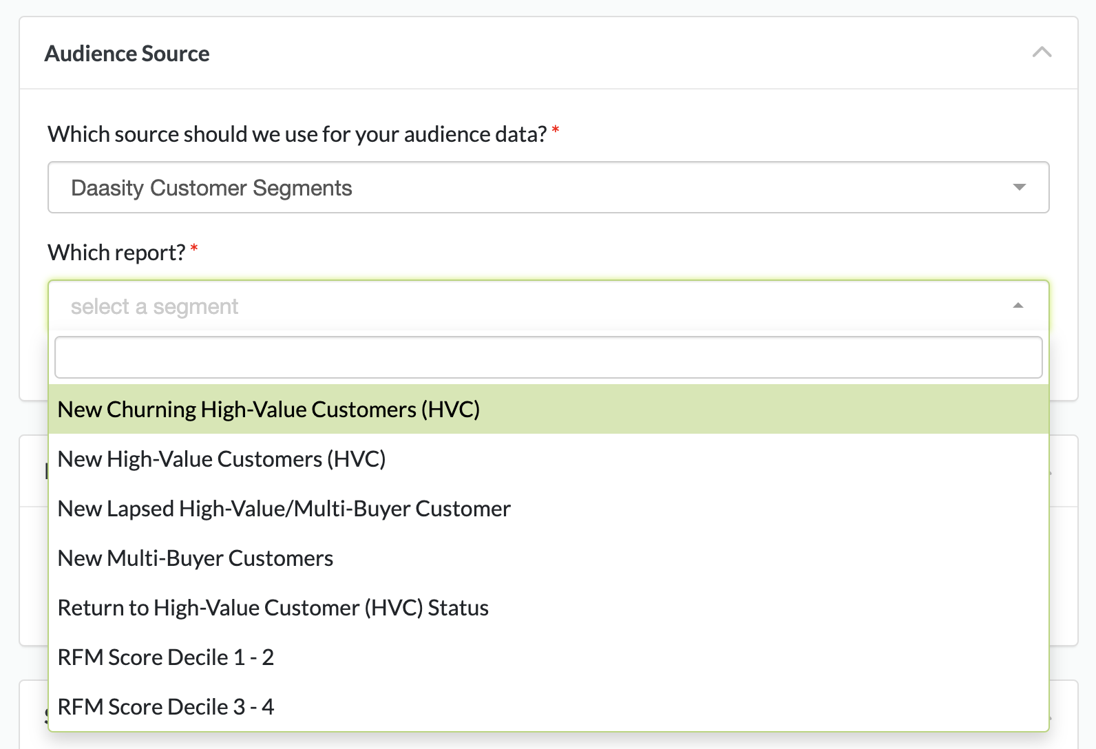 To use a pre-built Daasity segment just select the report you want to use:
