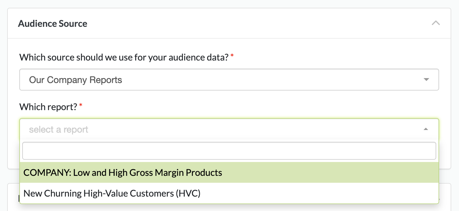 This option allows you to use reports that you have built in Looker and are kept in the "Audiences > Company Reports" folder within Looker.
