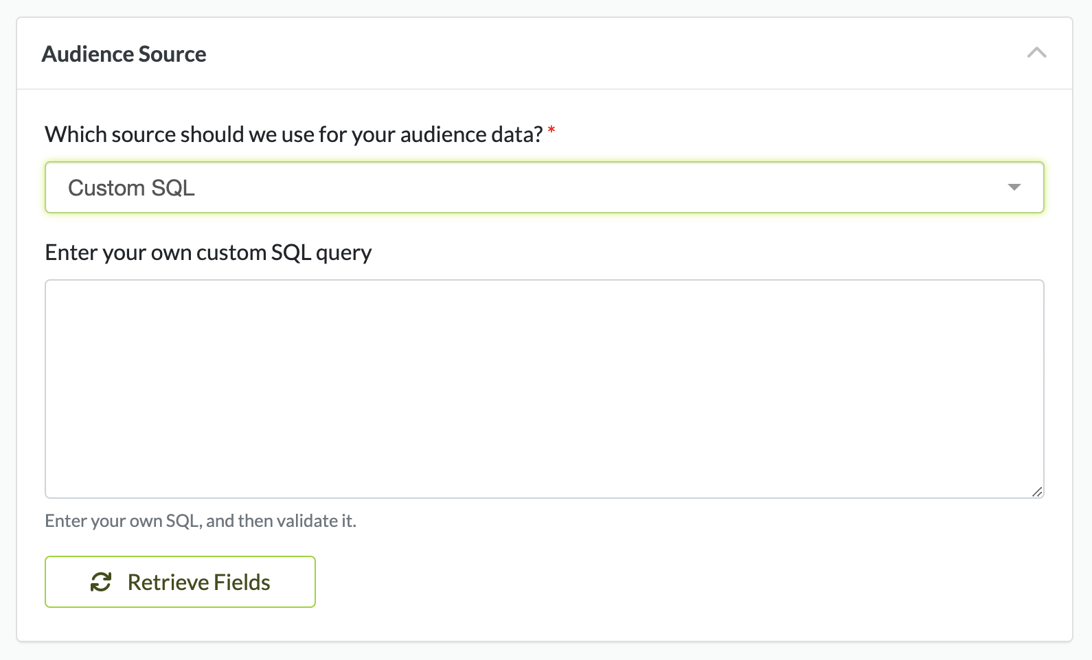 This option allows you to write any custom SQL that will run on your data warehouse at the time the workflow is set to push the resulting segment into your marketing platform: