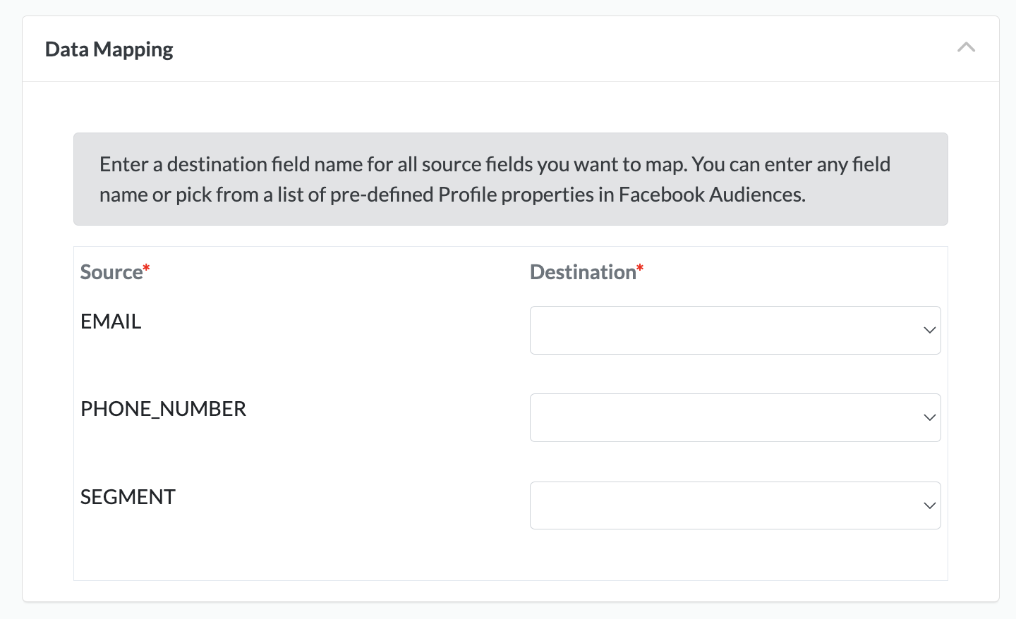 Select or enter the Destination for each Source that you want mapped and pushed to your Facebook Audience. If you leave a Destination blank then Daasity will not push that data element into the Target: