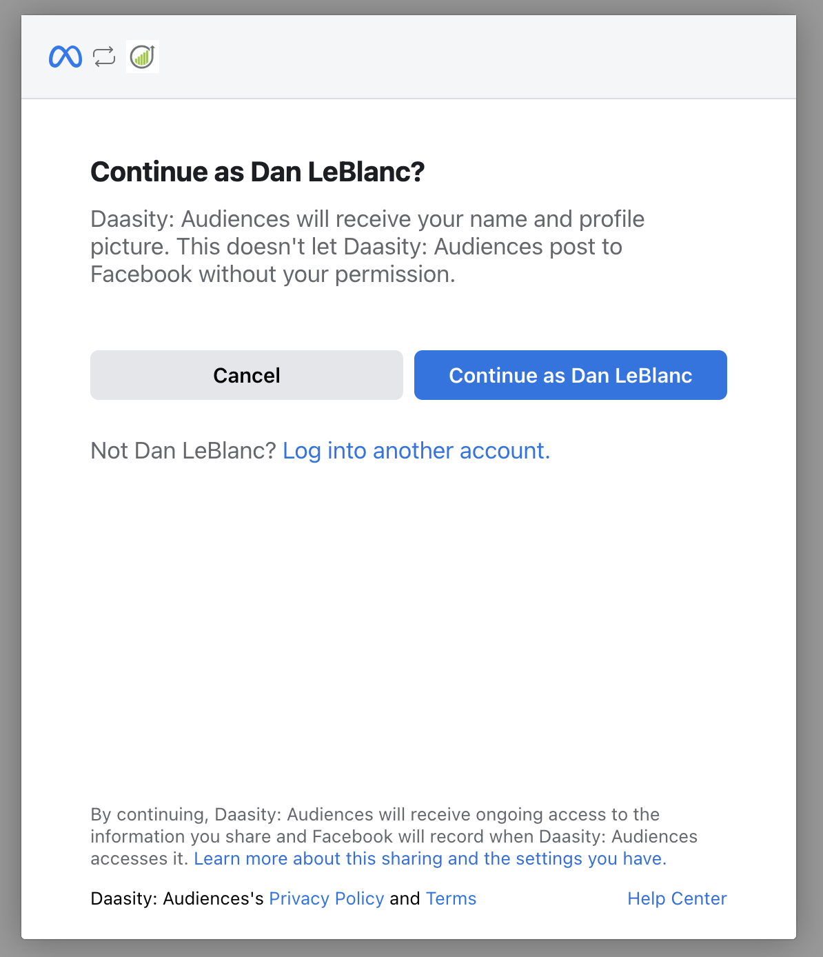 This will prompt you to login into the Facebook account that you have associated with this browser to make sure to select the correct Facebook account: