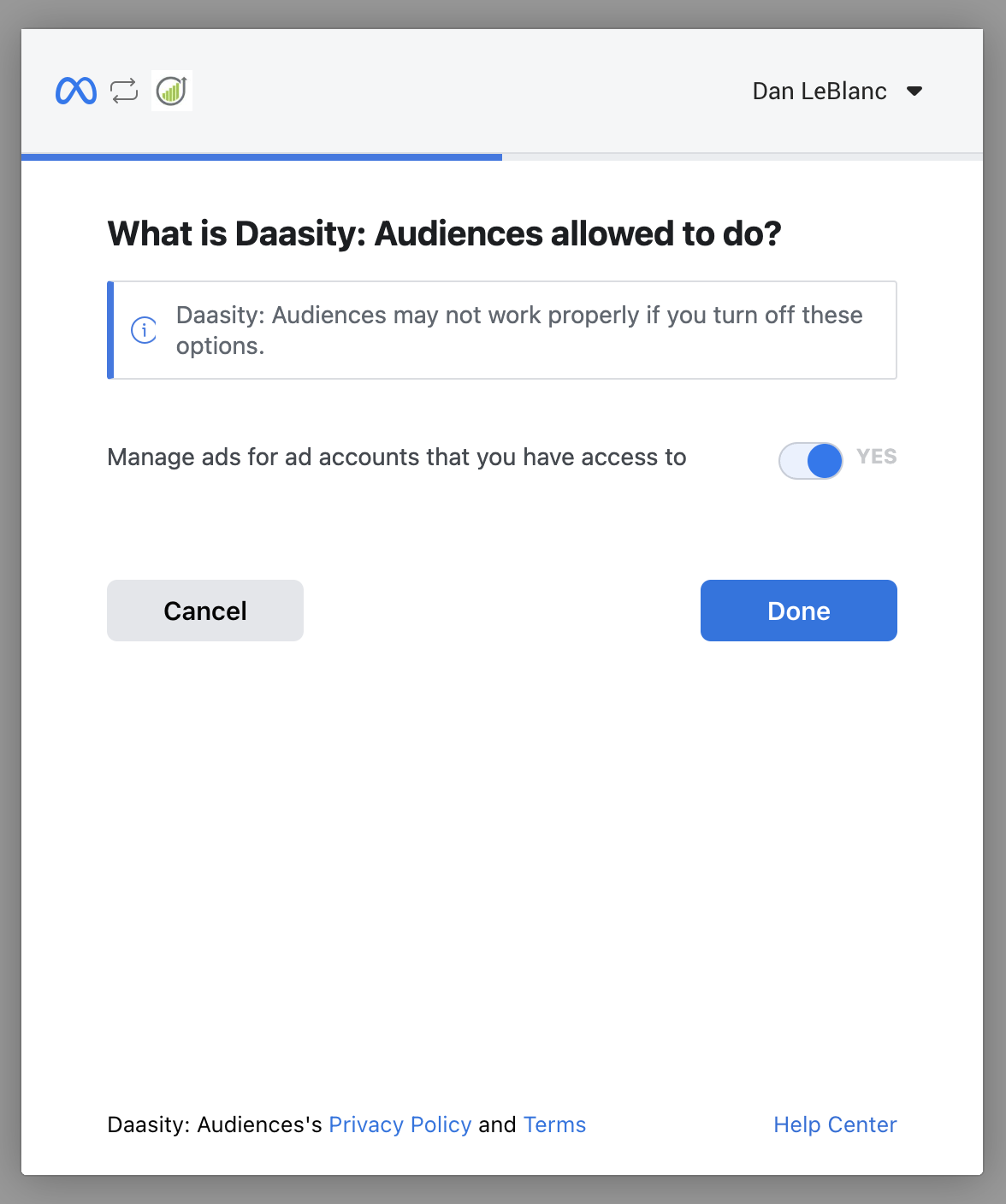 Allow Daasity to manage the ad accounts that your Facebook account has access to: