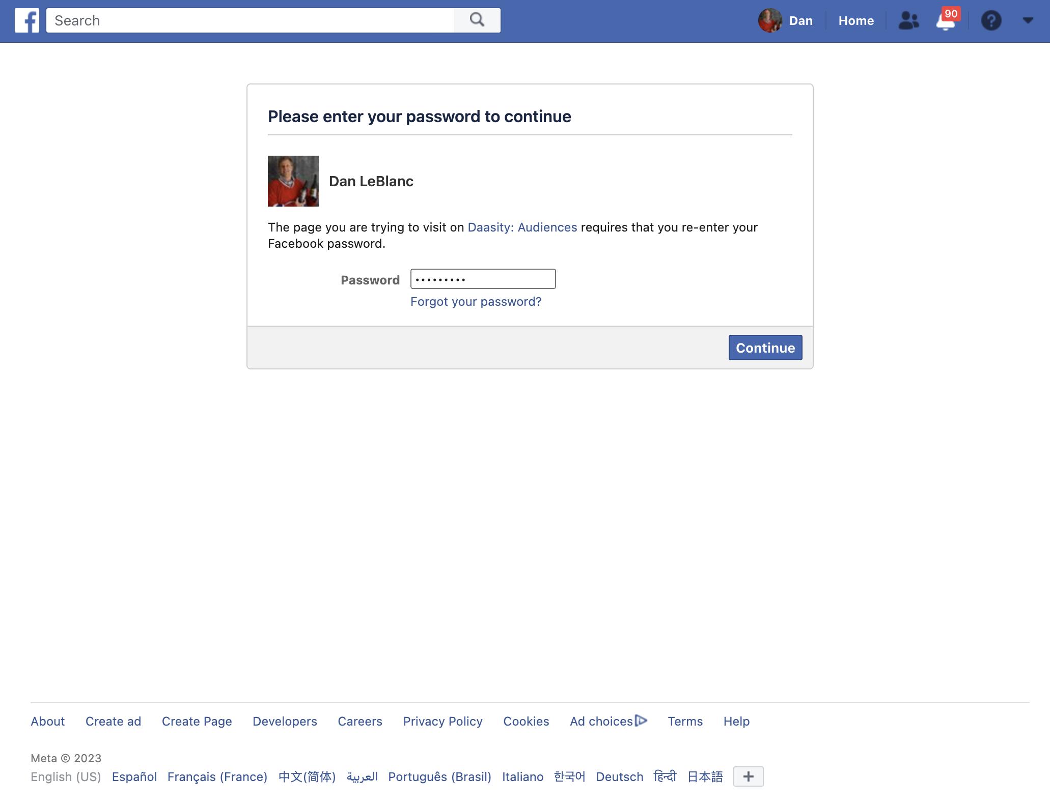 Click on "Continue" to enable Daasity to access your Facebook Account: