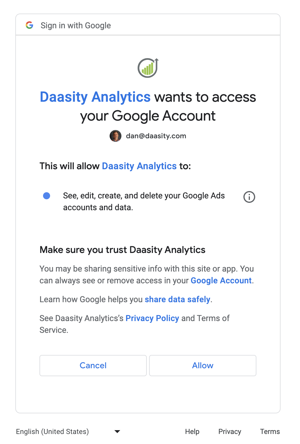 Click on "Allow" to authorize Daasity to access your Google account: