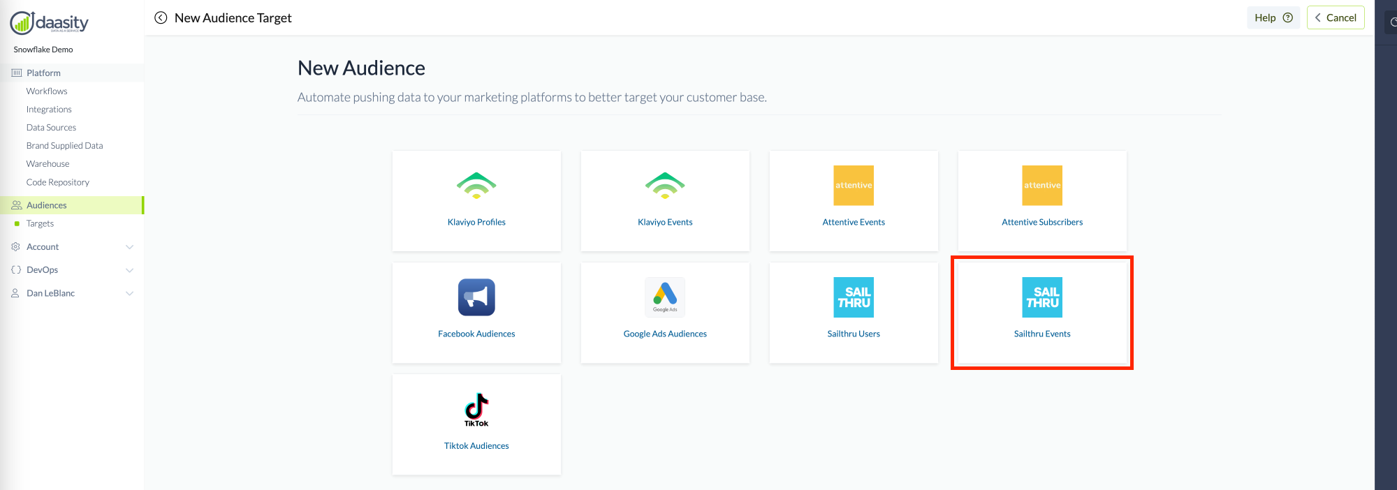 Once the Sailthru Events has been selected, fill out the information in the Target to enable the Daasity platform to extract, map and push the data into the Target