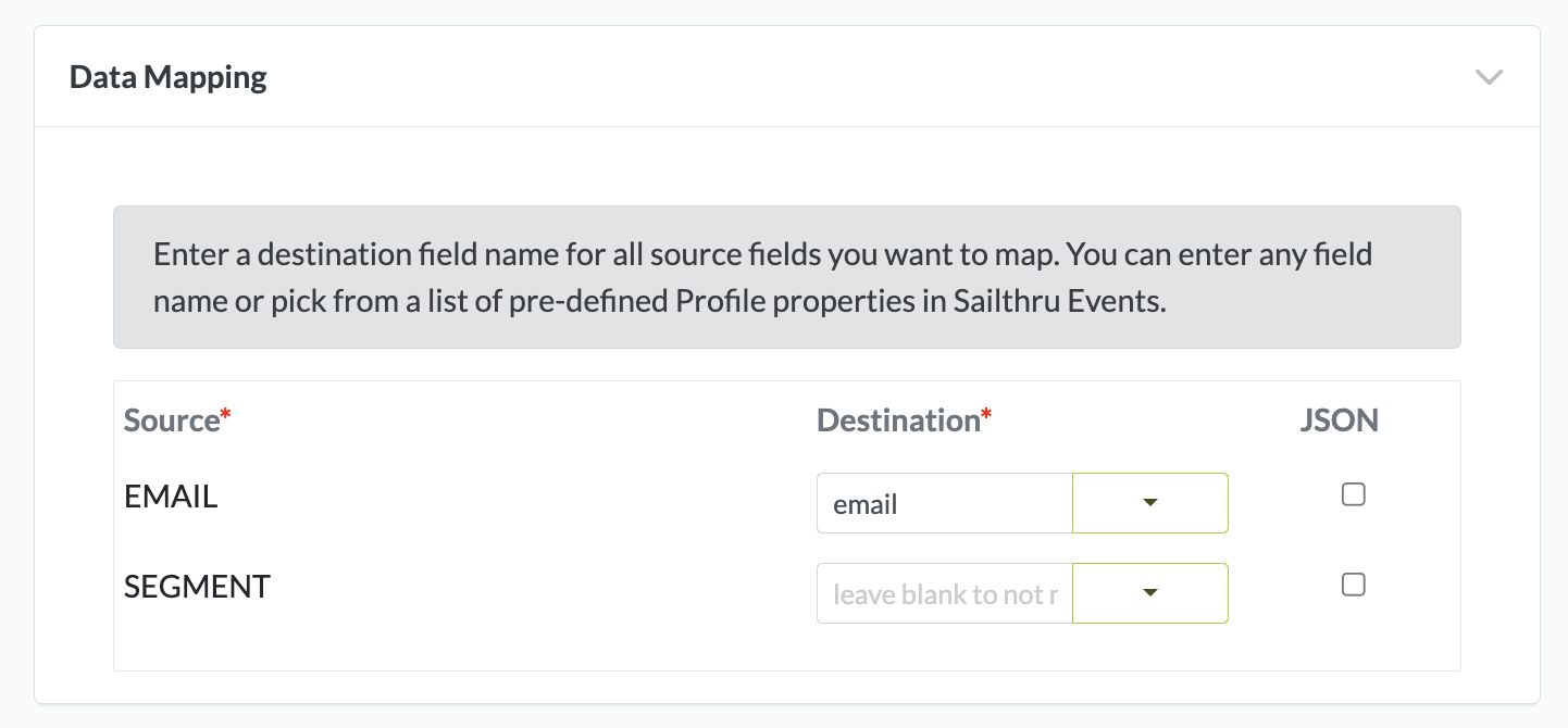 Click on the JSON box to send the data into Sailthru as JSON