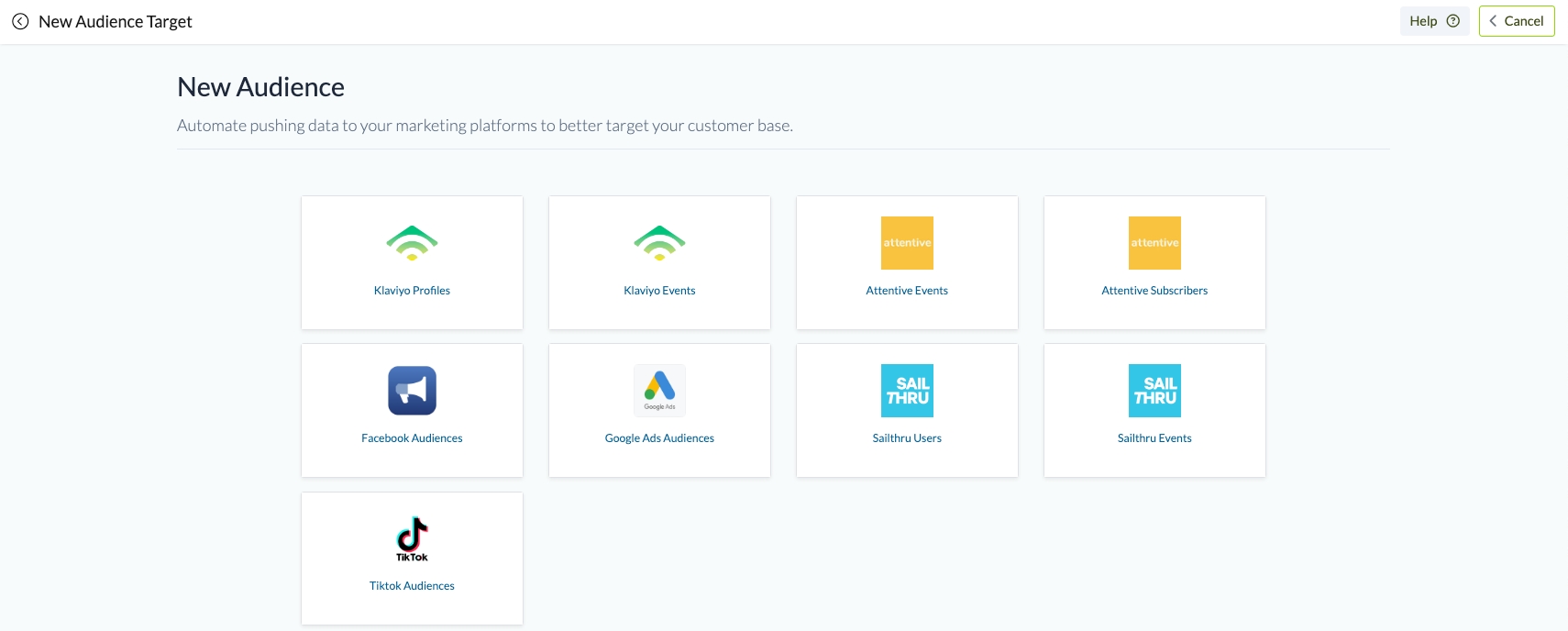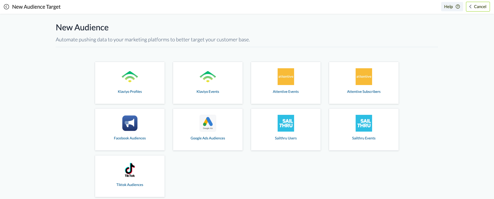 In the Daasity platform you will choose the endpoint first in our "New Target" page, and then you will define the data that you are pushing into the marketing platform via the endpoint.