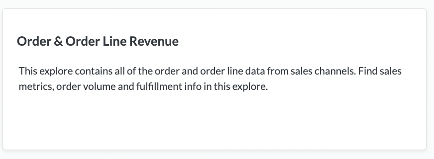 <figure><img src="https://content.gitbook.com/content/amTMWiPne1v1V3L7mbuj/blobs/rSwrlsAT4WMDbG2EMAHg/Screen%20Shot%202023-10-26%20at%201.44.17%20PM.png" alt=""><figcaption><p>Order and Order Line Revenue Explore</p></figcaption></figure>