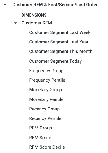 You will also be able to use the Customer Segment, Recency Group, Frequency Group, and Monetary Group dimensions in any explore that includes the Customer RFM & First/Second/Last Order view: