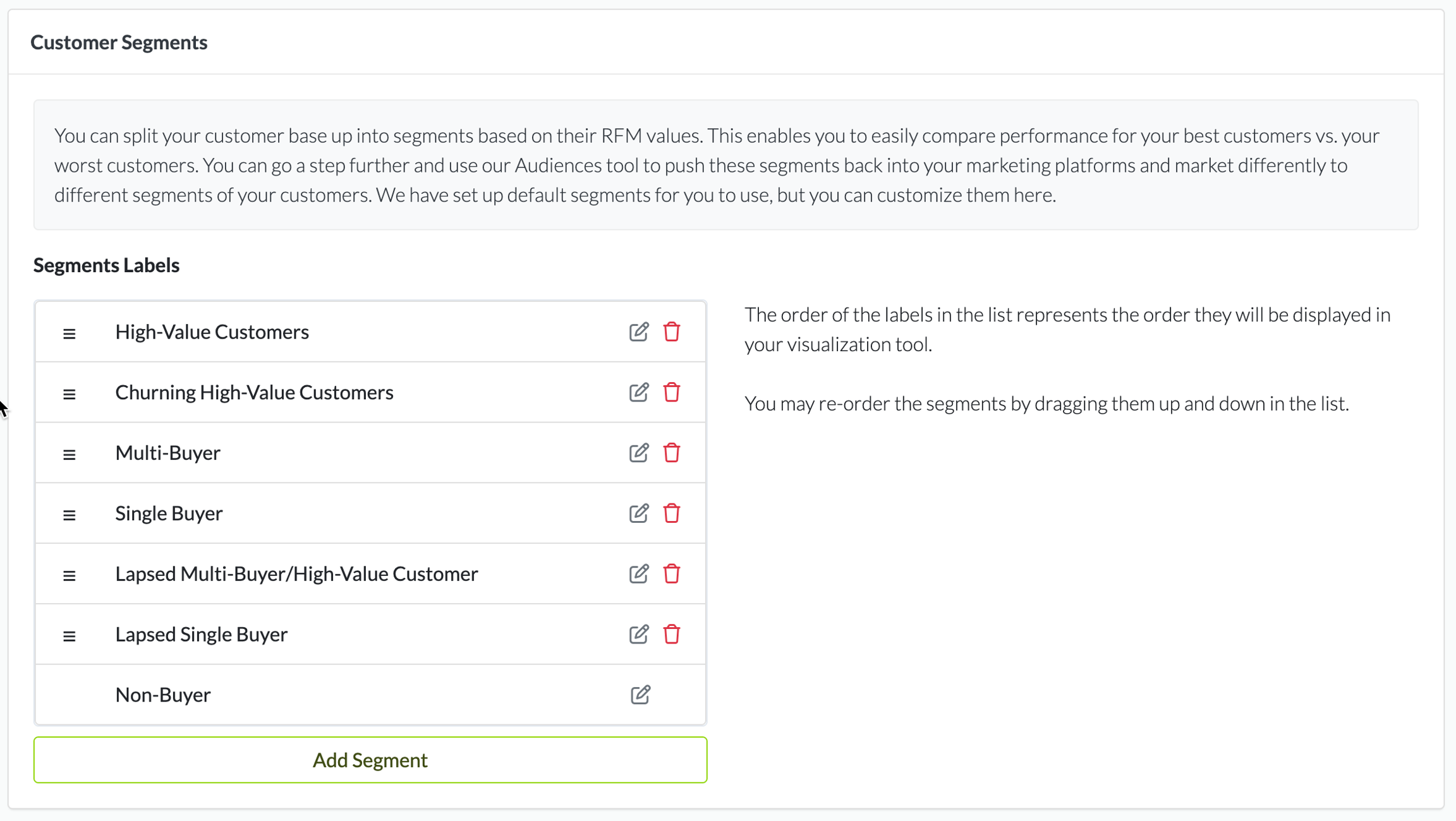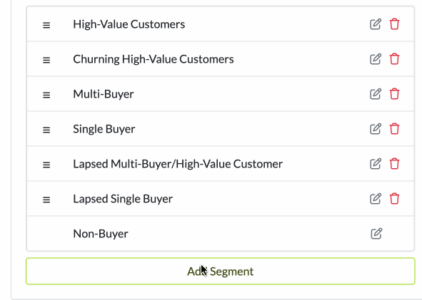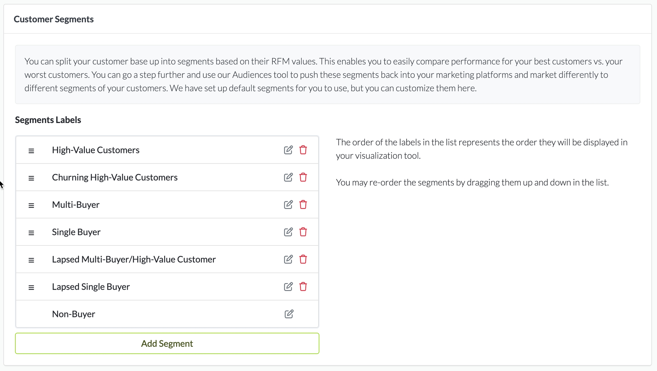 In this section, you can add, delete, or rename the customer segments that will be available in your reporting.