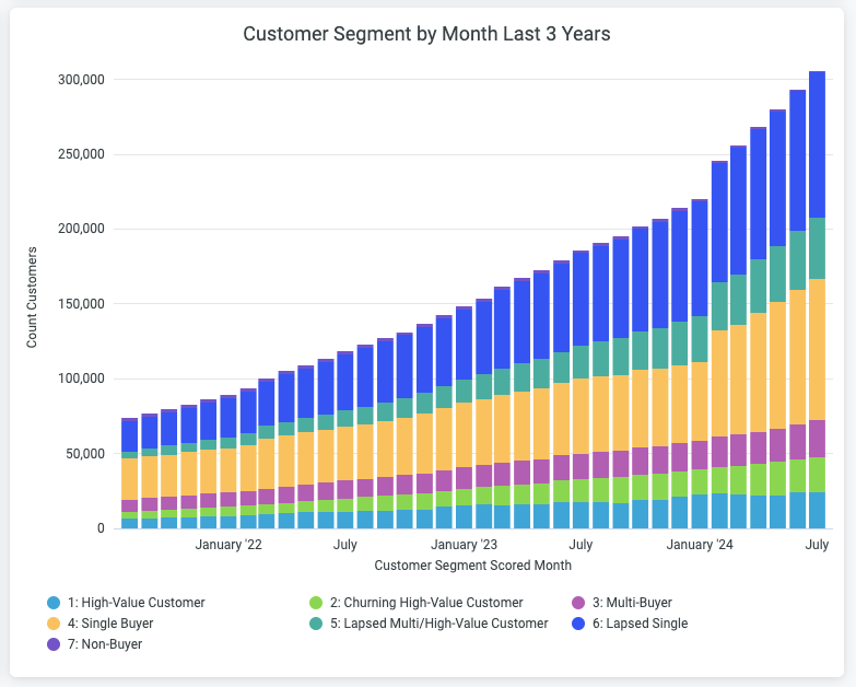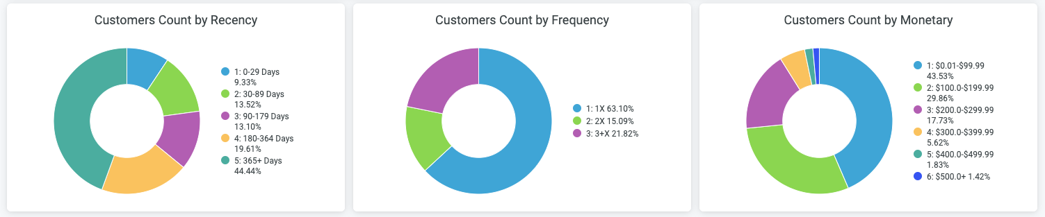 This allows you to quickly see the breakdown of how many of your high-value customers have recently purchased, how many are at risk of lapsing, and how many are lapsed.