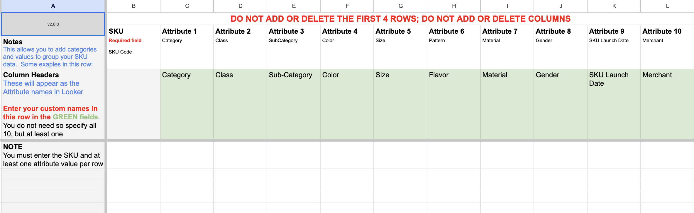 <figure><img src="https://content.gitbook.com/content/amTMWiPne1v1V3L7mbuj/blobs/GslAJMNsNlqbwJro3I1h/Screen%20Shot%202023-08-14%20at%2010.59.32%20AM.png" alt=""><figcaption><p>You can edt the Column Headers in Green to add your SKU Attributes</p></figcaption></figure>