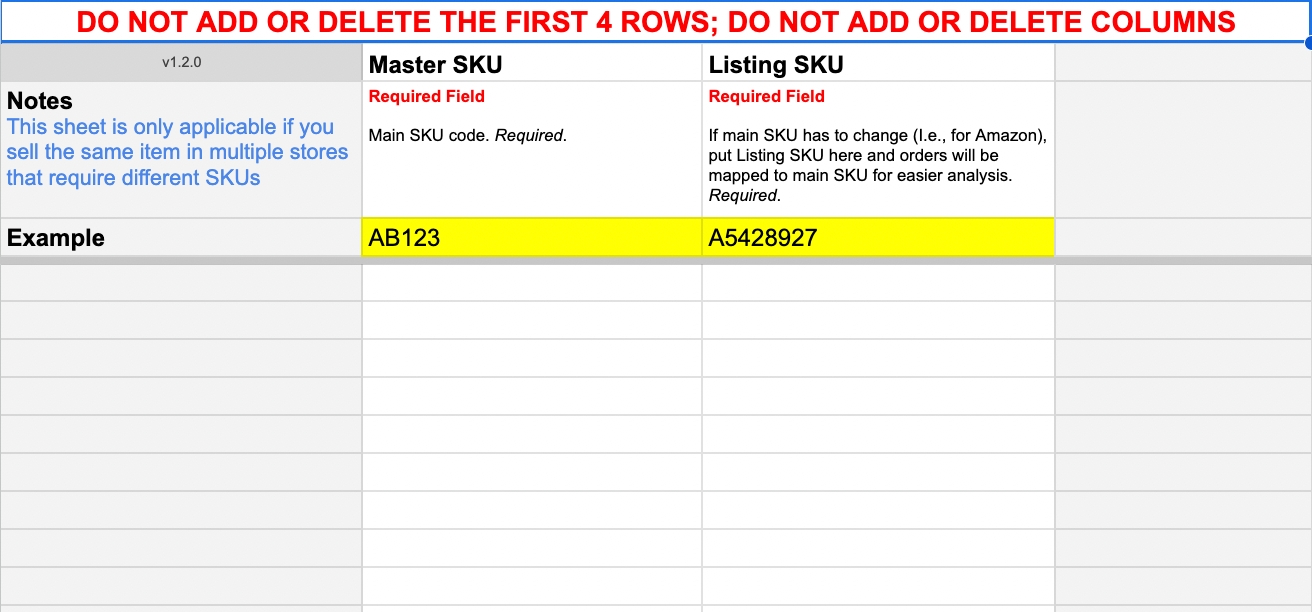 You can also use the SKU Mapping Sheet to analyze product level sales across different retailers. Enter the "SKU" or "PID" or "style ID" from the Retailer Spreadsheet as the "Listing SKU" in the BSD, and map it to your SKU from your ecommerce store.