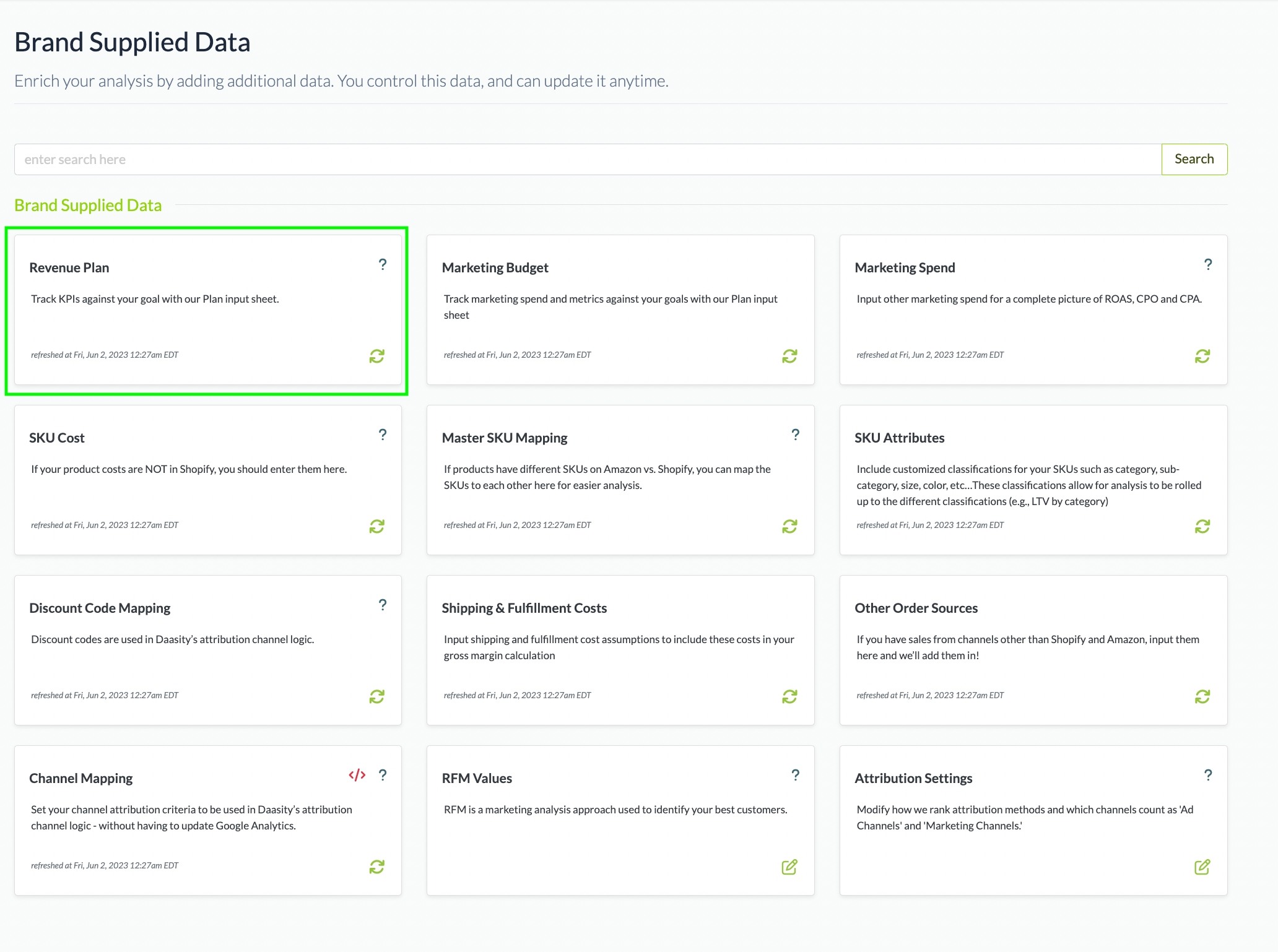 The Revenue Plan tab is used to input your Projected Sales, Orders, Units, Sessions and New Customers, to compare against the Actuals in Daasity.