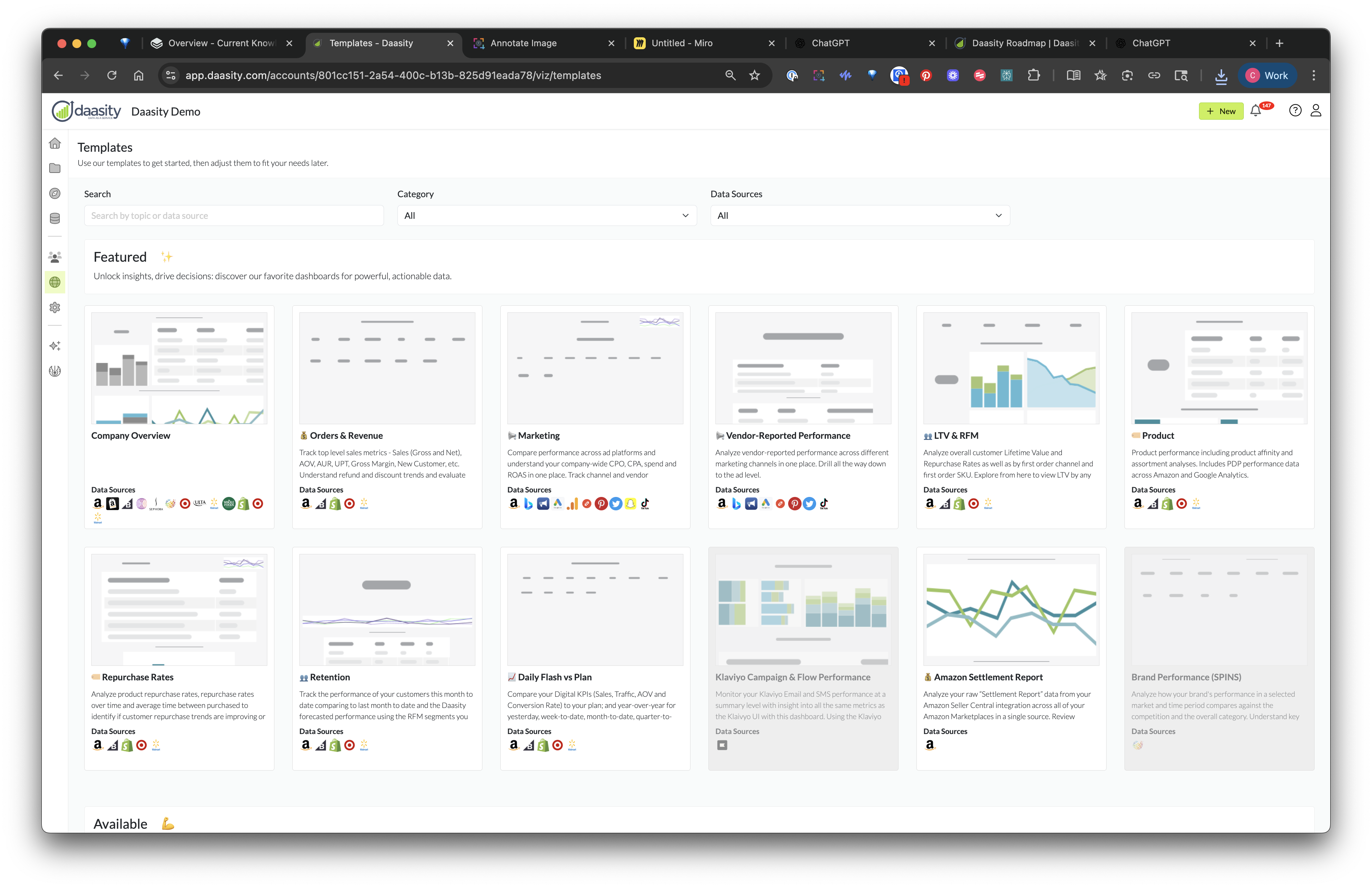 * Daasity provides a Templates library (sometimes called Report Library) of pre-configured dashboards built on either a unified data model, or data source-specific explore. Templates ensure you’re starting analyses with proven best-practice reports. Browsing Templates allows you to quickly save and customize a dashboard to your own Collections. For example, you might grab the “Flash Dashboard” template, which is a daily flash sales report, and save it to your Collection for tracking daily performance.  You can access Templates via the "Template Library" on the left-menu, or by clicking "New Dashboard -> From Template" using the top-right menu button.
