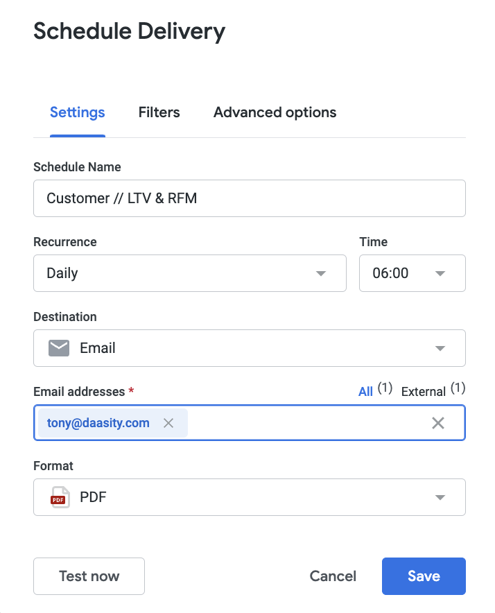 Choose the Data Format PDF or Visualization and Add the recipients' emails.&#x20;