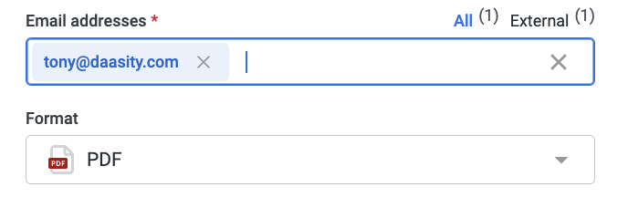 <figure><img src="https://content.gitbook.com/content/amTMWiPne1v1V3L7mbuj/blobs/u26RxS7nVo9or2qzZ8ac/Screen%20Shot%202023-11-27%20at%203.51.32%20PM.png" alt=""><figcaption><p>Add Recipients' Email Addresses and Choose the Format</p></figcaption></figure>