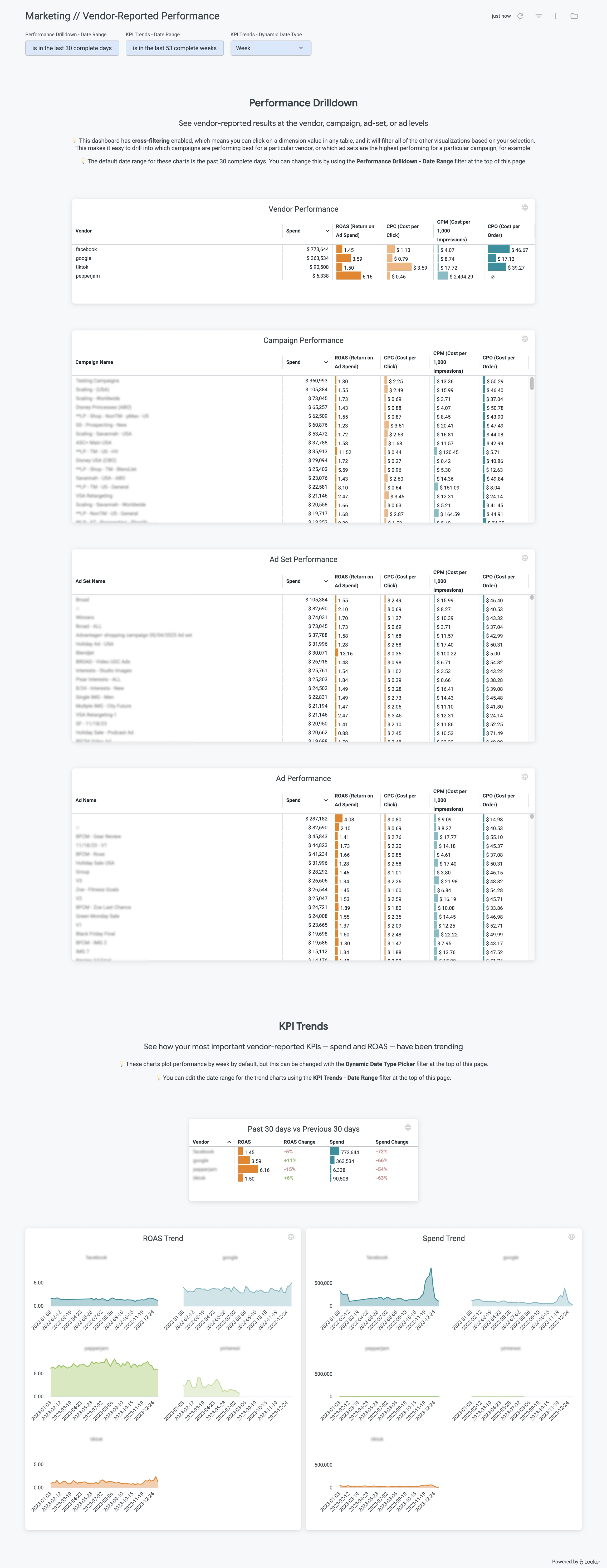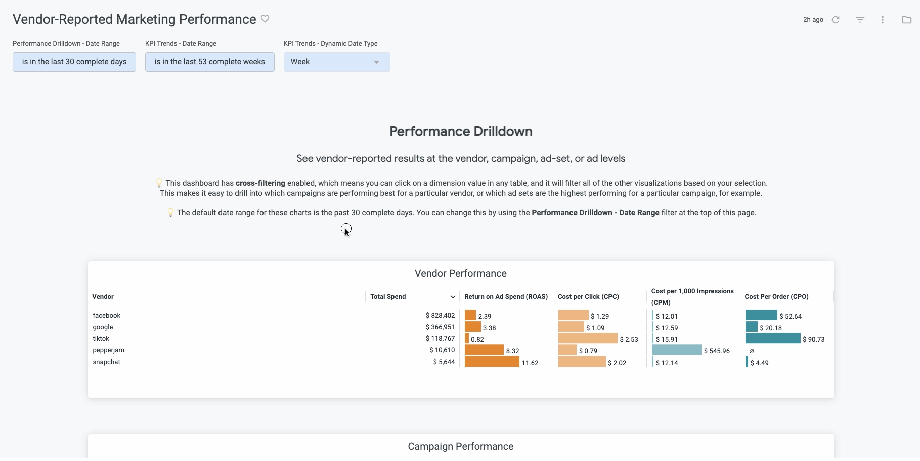 This dashboard has cross-filtering enabled, which allows you to easily drill down and segment the entire dashboard with a few clicks. If you click on a vendor from the Vendor Performance tile, for example, the entire dashboard will filter to only show results for that specific vendor. You can continue segmenting to show only results for specific campaigns from that vendor, etc.