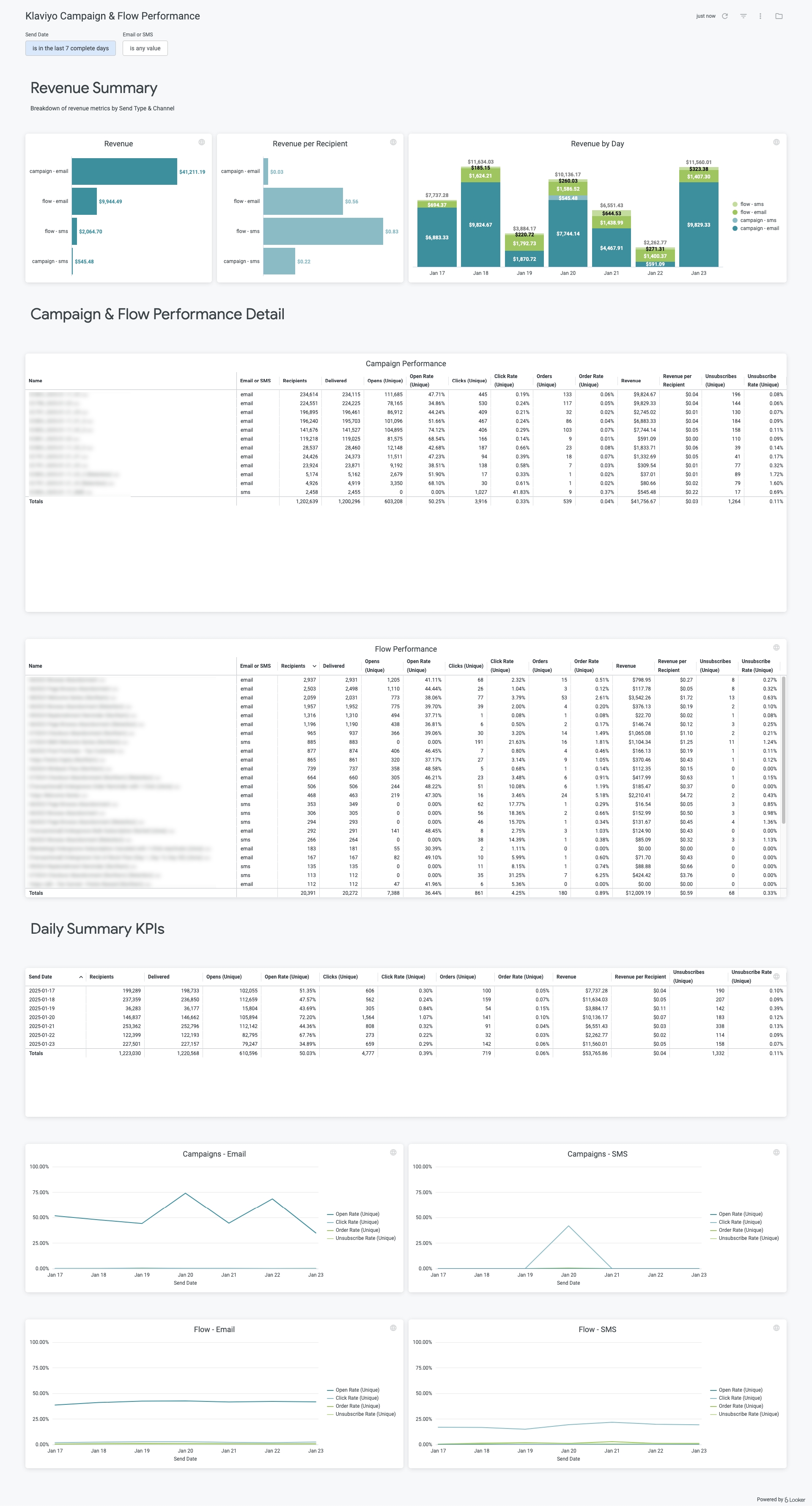 All of the visualizations in this dashboard use the Klaviyo Campaign & Flow Performance explore.