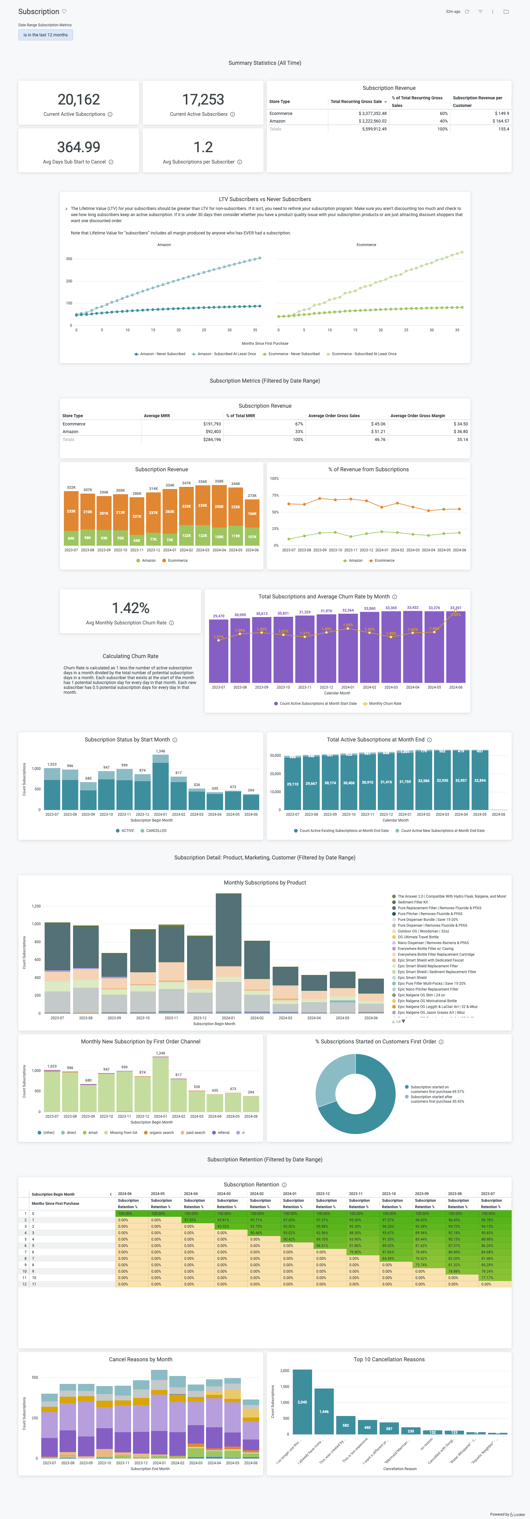 * **Subscription Detail: Product, Marketing, Customer —** This next section focuses on detailed subscription information at the monthly level.