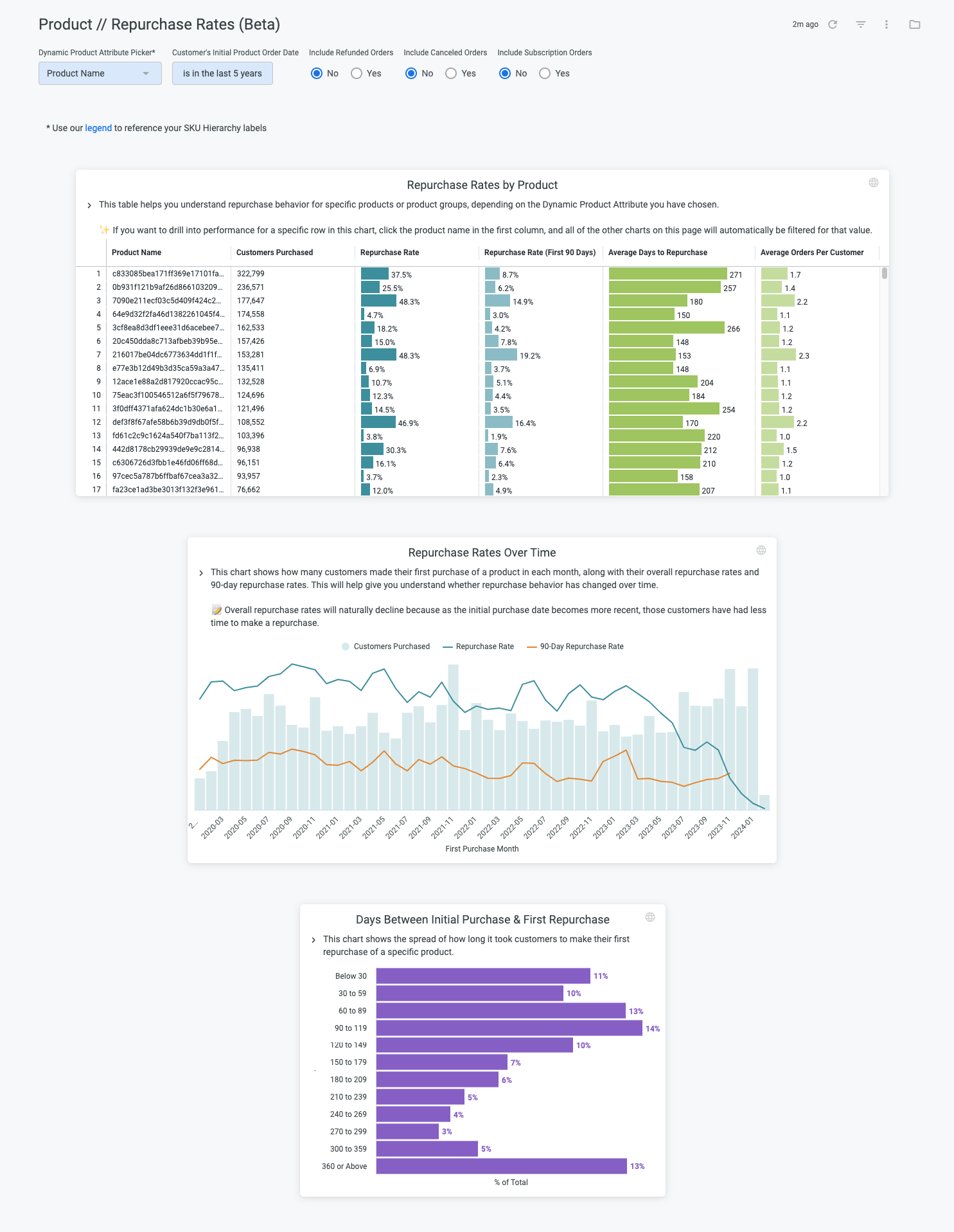 The Product Repurchase Rate (Beta) dashboard helps you understand repurchasing behavior across your product line.