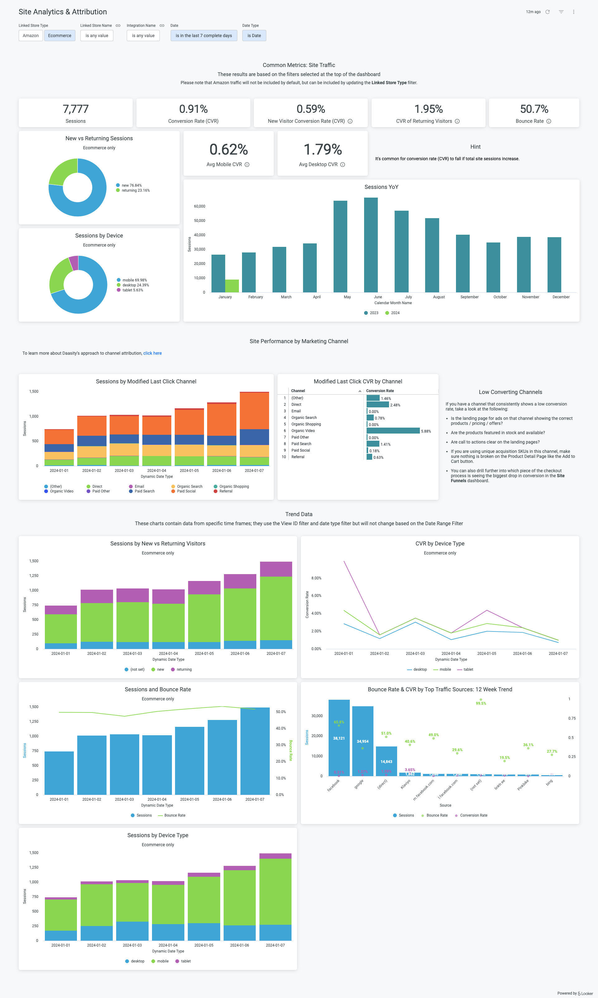 The **Site Analytics & Attribution** dashboard will be available in your dashboard list by default. However, it will only contain data if you have a [Google Analytics](https://help.daasity.com/extract/integrations/google-analytics-universal-analytics/integration-setup) integration, [Google Analytics 4 via API](https://help.daasity.com/extract/integrations/google-analytics-4/api-integration/integration-setup) integration, or [Amazon Seller Central integration](https://help.daasity.com/extract/integrations/amazon-seller-central/integration-setup/configure-amazon-reports) (with the **Sales and Traffic** report enabled).