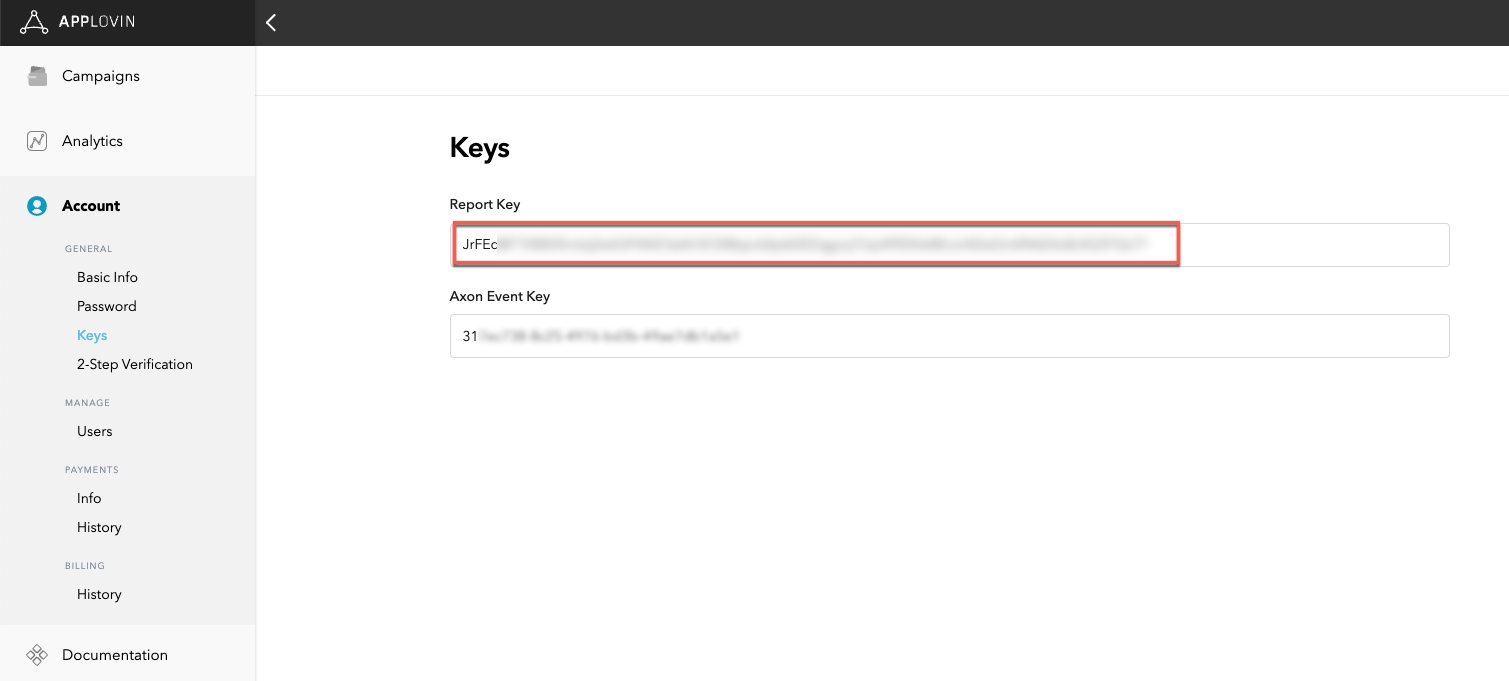 3. Copy the Report Key. If you do not see a report key, double-check that you're logged in through the master user account — Not a sub-user account