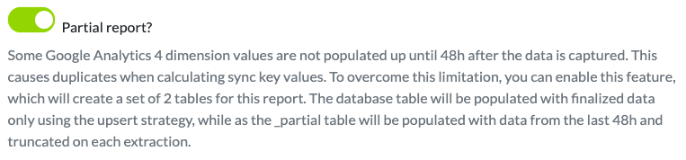 When you turn the Partial report option on, the integration will actually create two tables, for example ga4_api.custom_landing_page and ga4_api.custom_landing_page_partial.