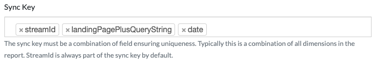 Typically you will only want to edit this field if you are including a unique identifier like transactionId in your custom report. In that case, you would want to use only transactionId + streamId as the sync key.