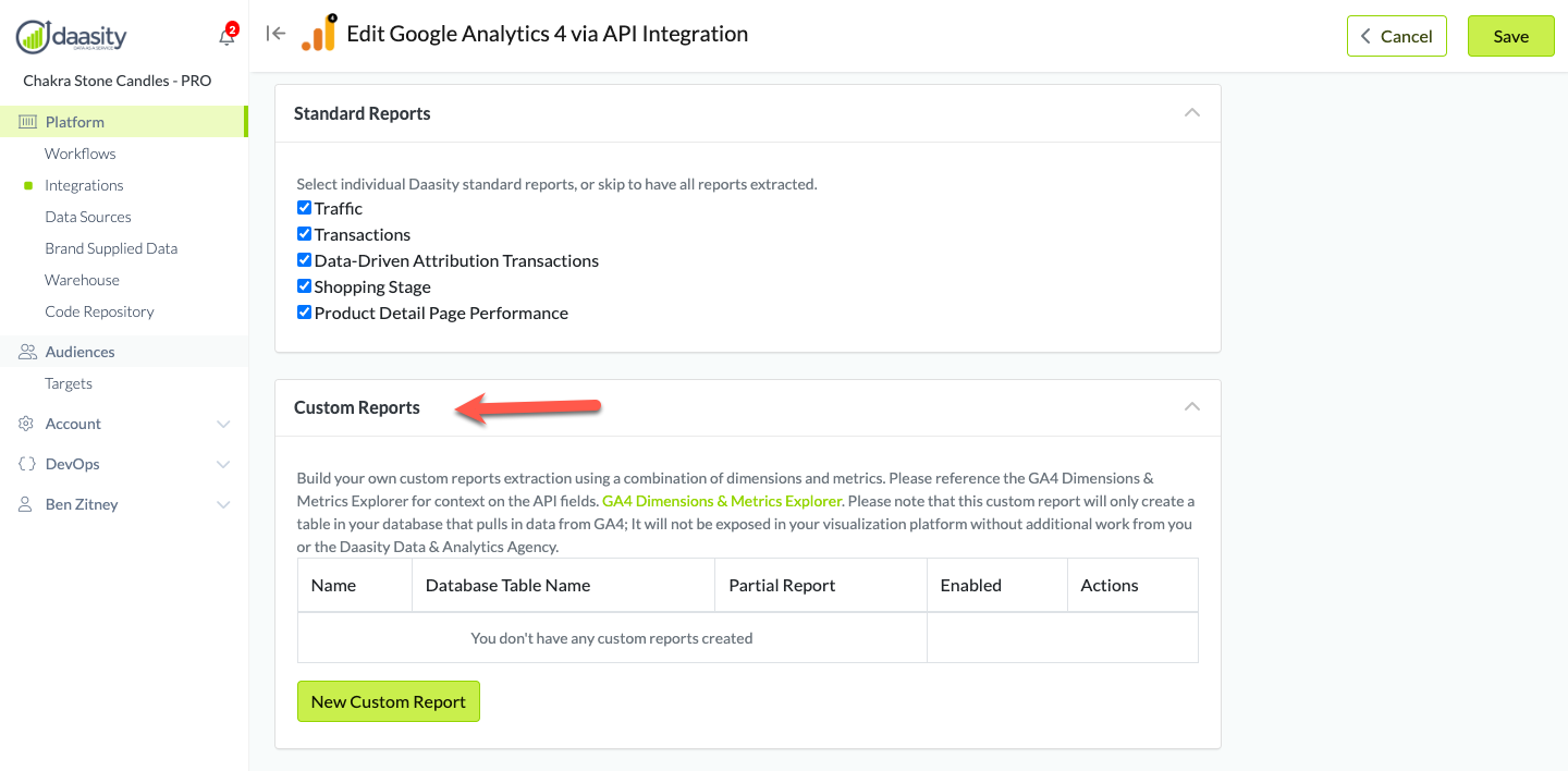 Open your GA4 API integration and click "Edit" in the upper right corner. If you scroll down, you will see the Custom Reports section, where you can create a new custom report: