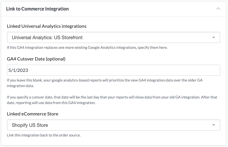 When you set up a GA4 integration, you have the option to link it to an ecommerce store and specify which UA integration the data should blend with. This is essentially telling Daasity which old UA integration the new GA4 integration will be taking over for: