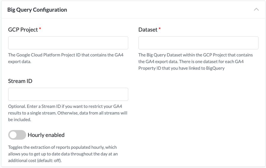 Before setting up this integration, you should already have linked your GA4 property to a BigQuery project in Google Cloud Platform, and the linkage should already be populating data in the BigQuery project.