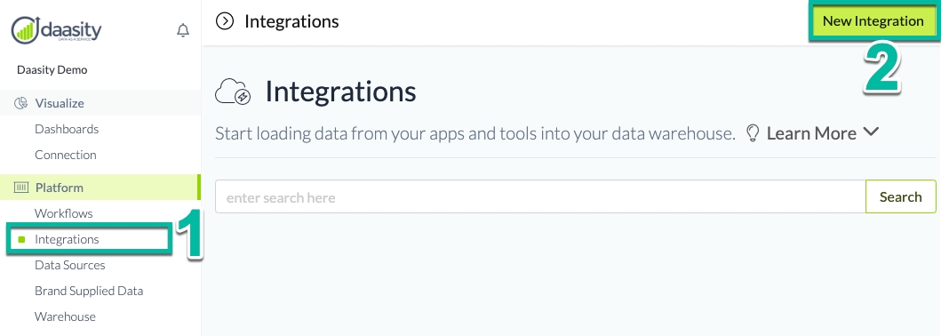 Click on Integrations on the left nav bar and then click on New Integration in the upper right: