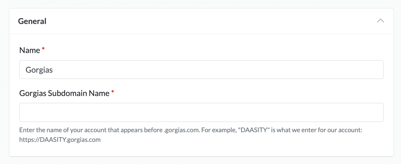 The Gorgias Subdomain Name will be the first portion of the URL of your Gorgias admin. For example, if when you log into Gorgias, the URL is https://daasity.gorgias.com, the subdomain value would be daasity.