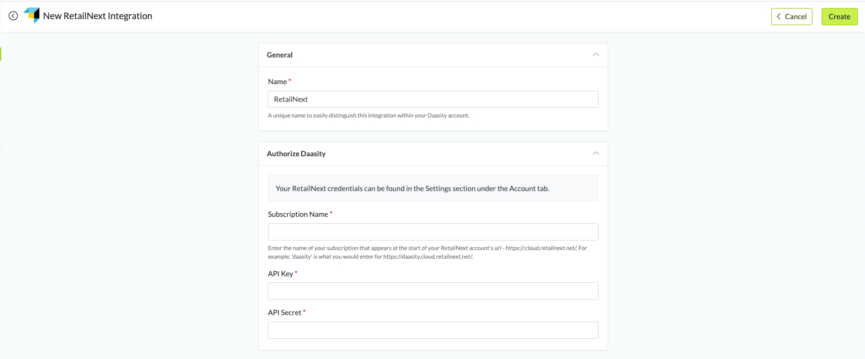 You should get your Retail Next credentials which can be found in the Settings section under the Account tab prior to following the steps below