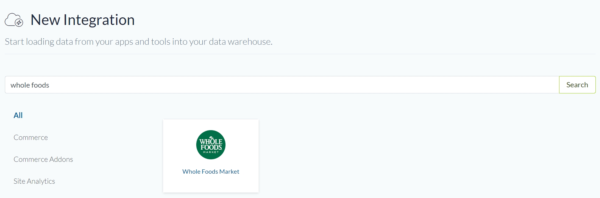 In the search box, type "Whole Foods" and choose the "Whole Foods Market" integration.
