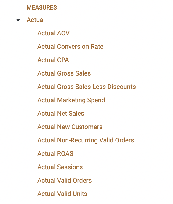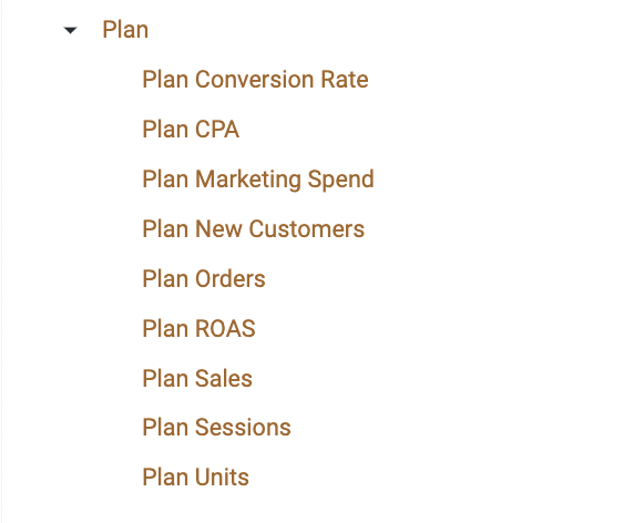 The Planned Measures are taken from your [Revenue Plan](https://help.daasity.com/core-concepts/custom-data-and-enrichment/revenue-plan-forecast/e-commerce-revenue-plan) in your BSD Sheet.
