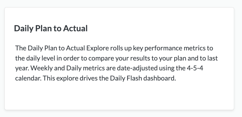 The Daily Plan to Actual Explore adjusts your Actual Weekly and Monthly metrics [according to the 4-5-4 calendar](https://nrf.com/resources/4-5-4-calendar) to show Daily Numbers.
