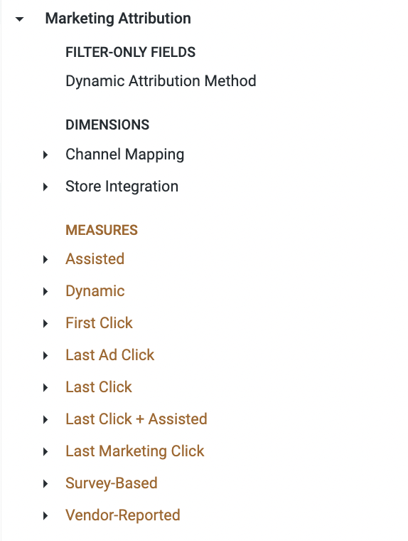You can choose which **Attribution Model** to use when building a report with the Marketing Attribution Explore.