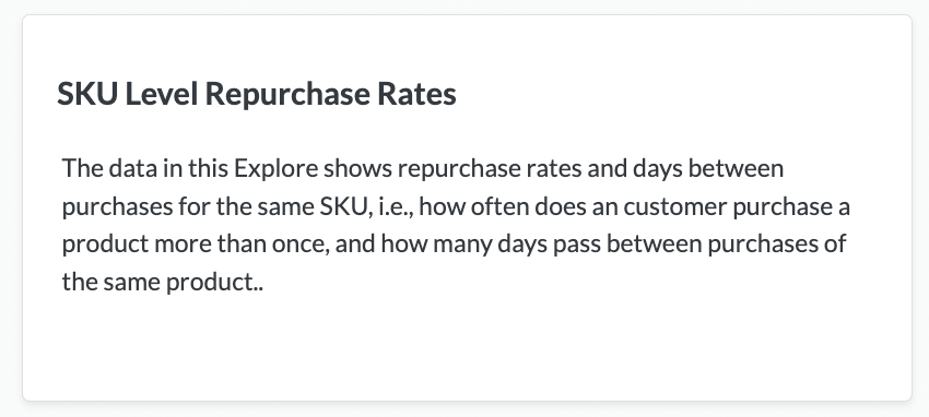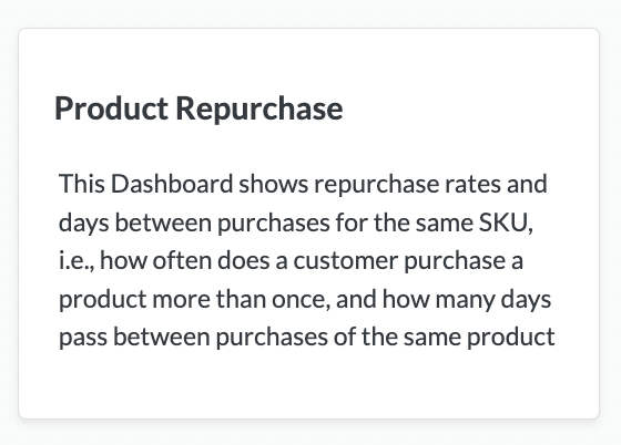 ## The [Product Repurchase Rate](https://app.gitbook.com/o/RbguI7m6gAdLWQlsKt8D/s/WDvO31PP3F01d6jisBTt/~/changes/569/visualization/dashboards/standard-dashboards/product-repurchase-rate) Dashboard is a Standard Out-of-Box Daasity Dashboard Built Using the SKU Level Repurchase Rates Explore