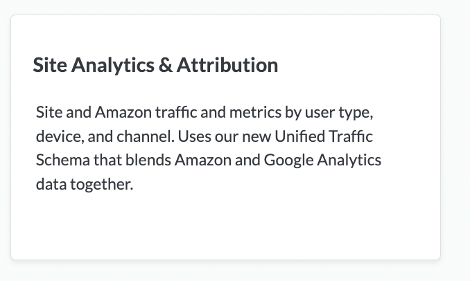 Contains blended shopping and traffic data across Google Analytics, GA4 and Amazon Seller Central