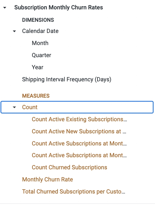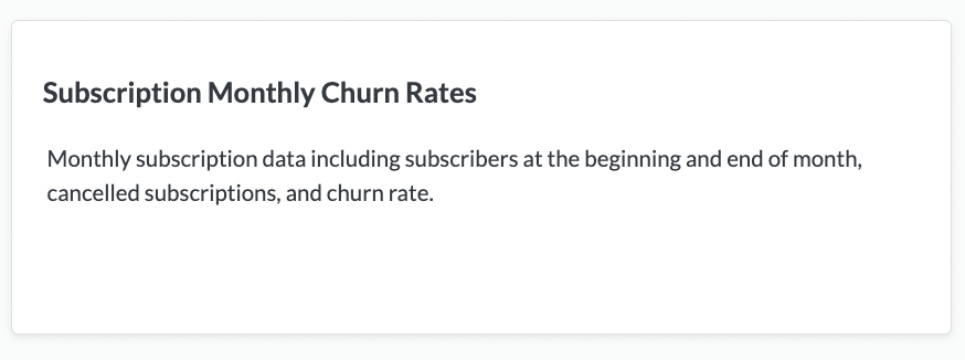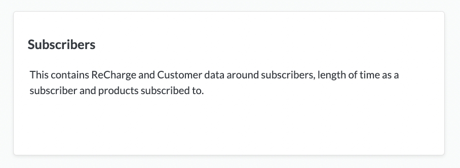 Analyze subscription business performance with comprehensive customer and churn data from Recharge integration, formerly known as Subscribers and Subscription Monthly Churn Rates Explores. Two separate explores (Subscribers & Subscription Monthly Churn Rates) provide detailed subscriber information and monthly churn analysis to optimize retention and subscription growth.