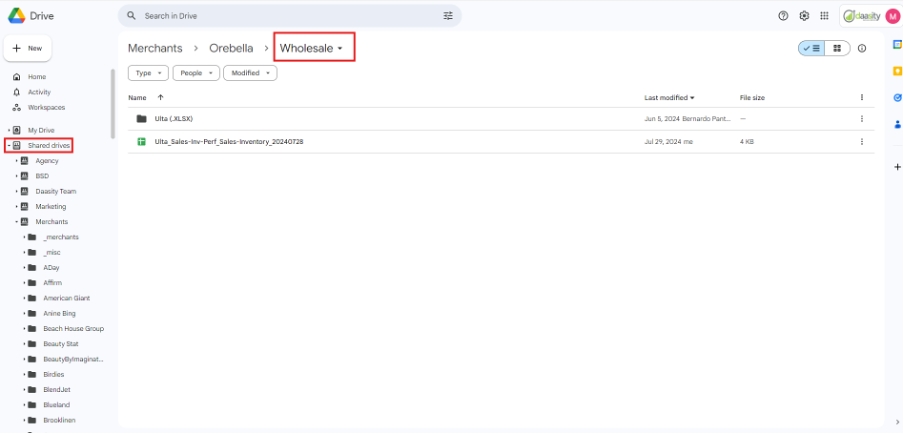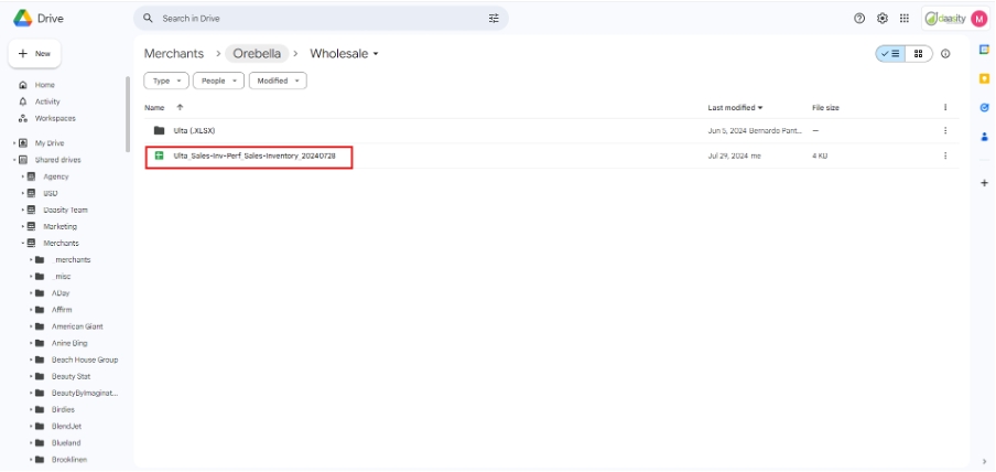Shared drives – Merchants – Orebella – Wholesale – Ultra (XLSX) – Save with the same file name with the previous day date( If we are doing on Monday save on Sunday date)
