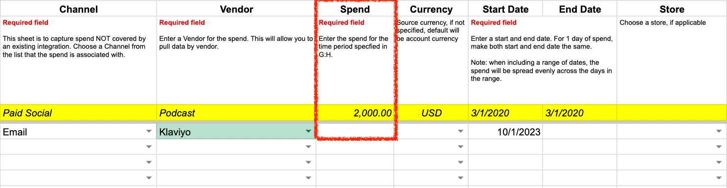 Track your Marketing spend for Vendors and Affiliates that are Not tracked via an API (e.g. Klaviyo, Rakuten)