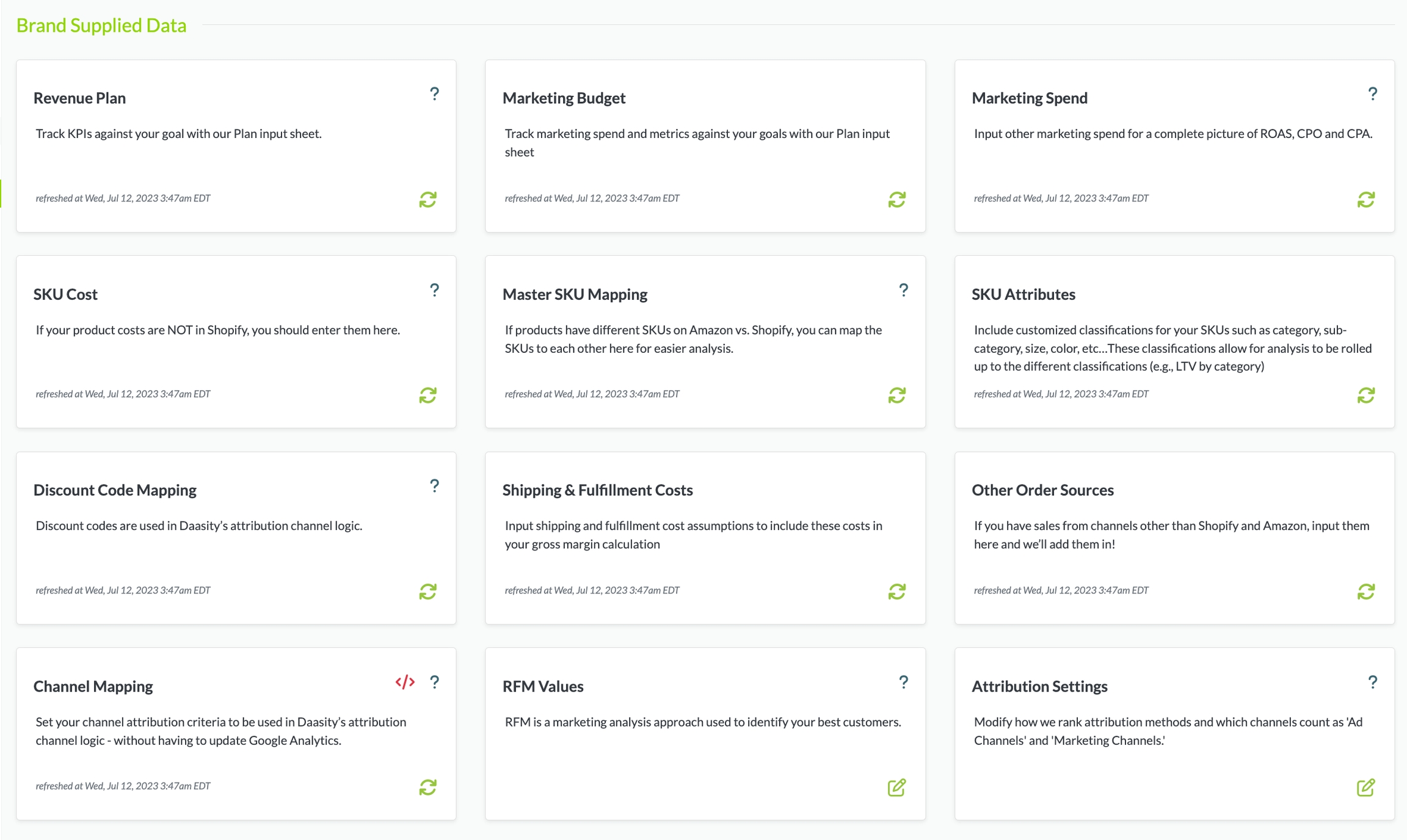 You can enrich your data with Daasity's data management tools - ie the "Brand Supplied Data Sheet"by adding supplemental data and modifying existing data. You can update your BSD Sheet at anytime.