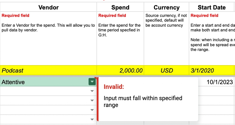 Enter your Vendor in the Vendor column of the Configuration tab to populate in the dropdown menu of all applicable Sheets