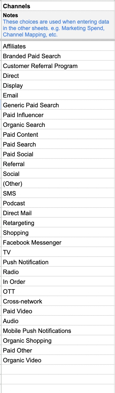 The Marketing Spend and Marketing Budget, Discount Code Mapping and Channel Mapping require a Channel and Vendor input.