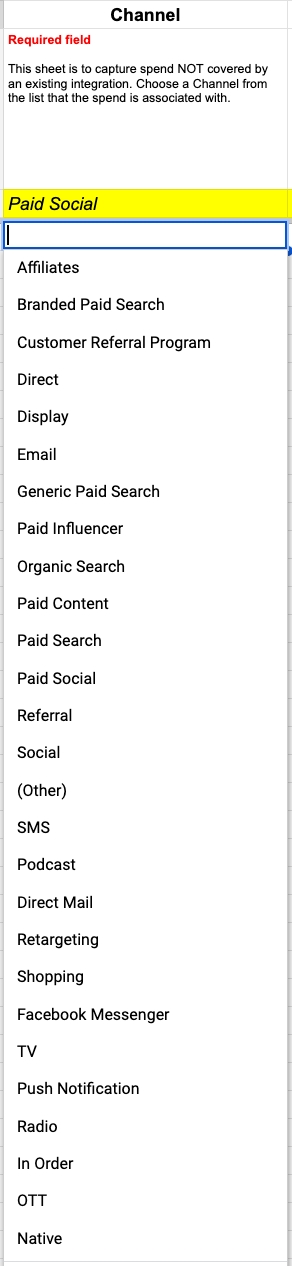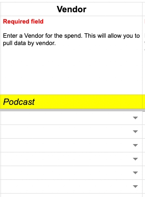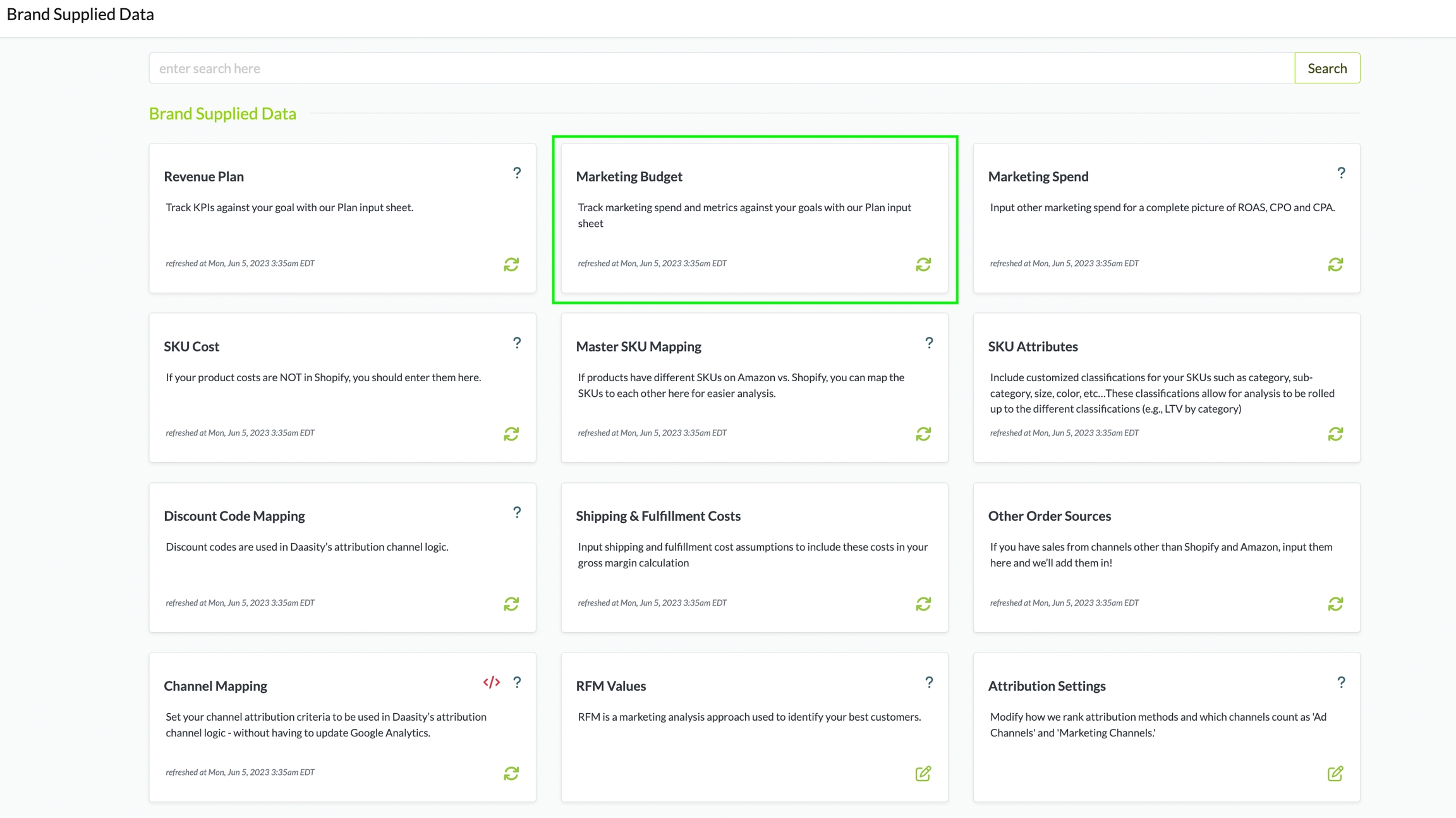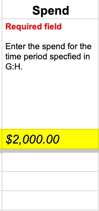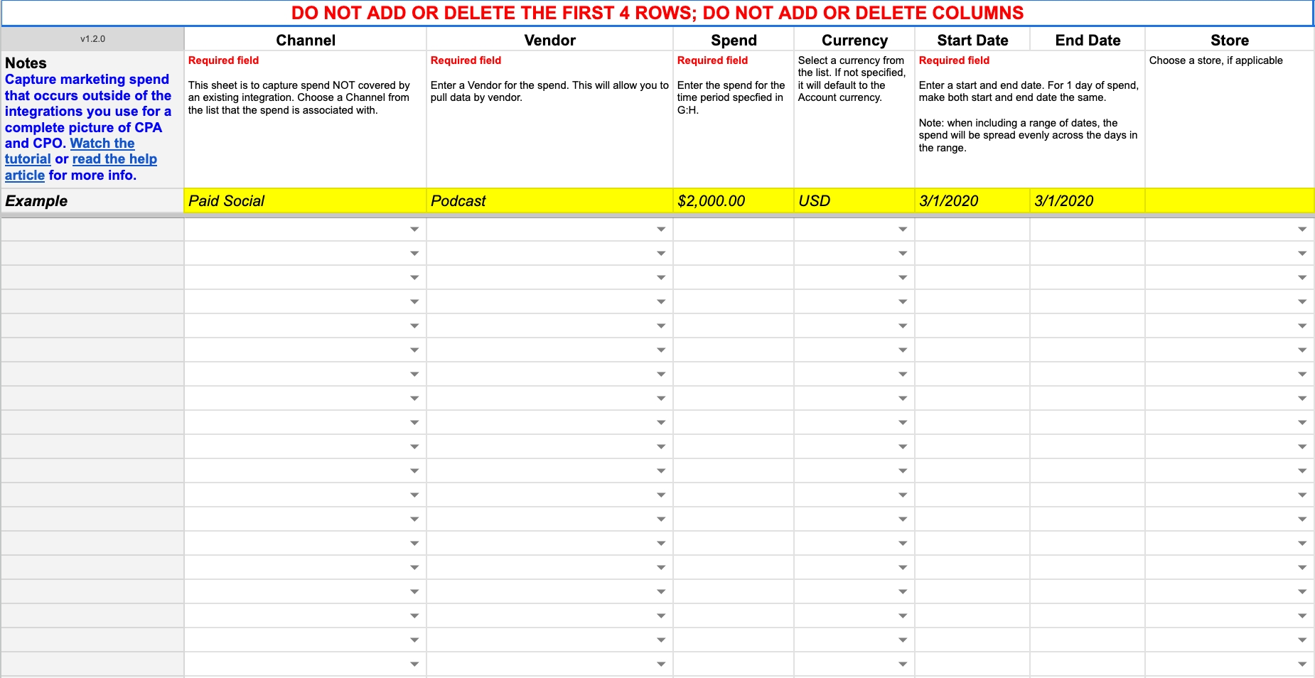The Marketing Spend tab is used to input your Targeted Marketing Spend, CPA, and ROAS for your Marketing Vendors, to compare against the Actuals in Daasity.